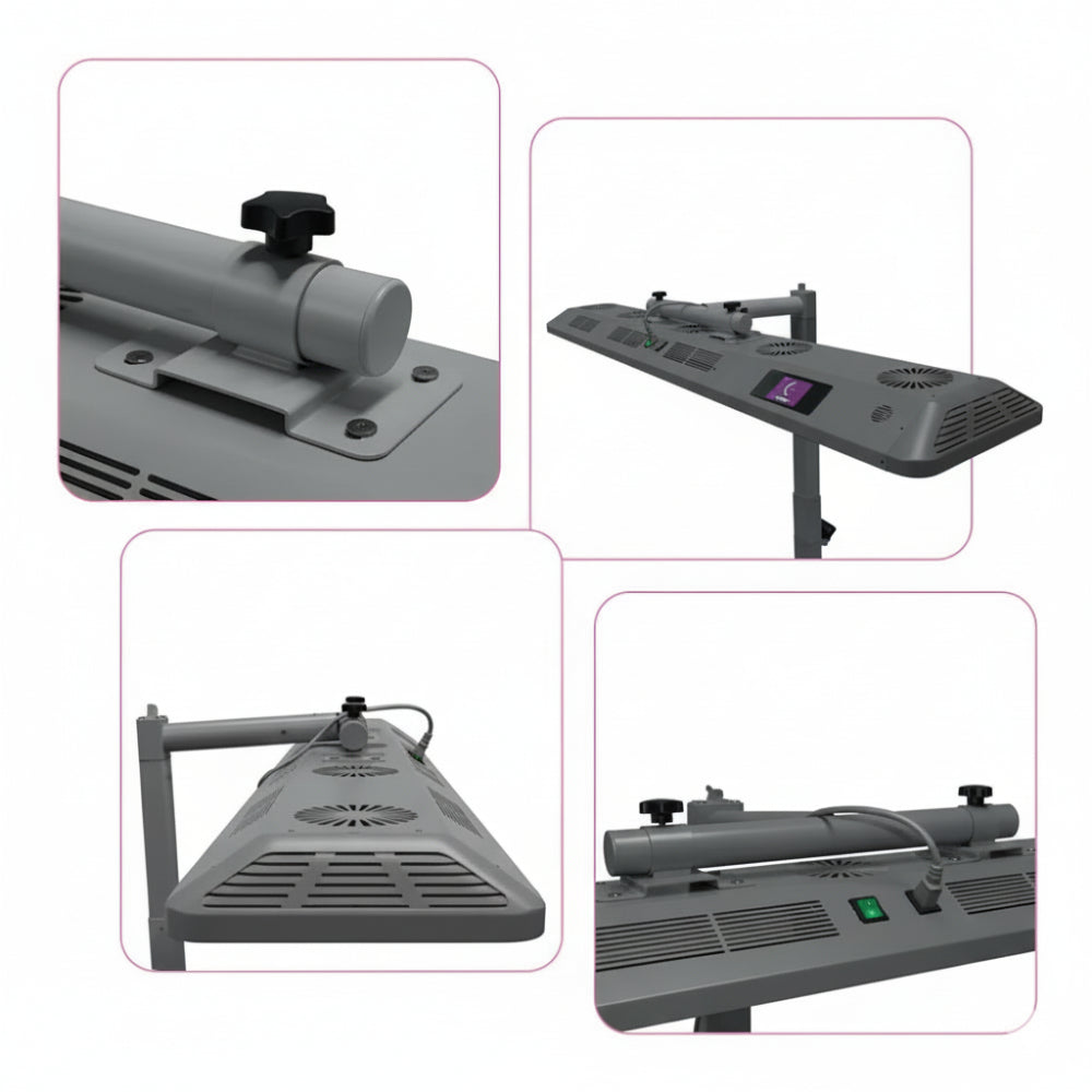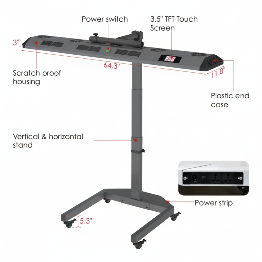 Designed for full-body renewal at home. ≈ 5 ft 4 in tall x 1 ft wide (480 LEDs, 7 wavelengths), 39.6 lbs with adjustable electric stand for lying down or standing.